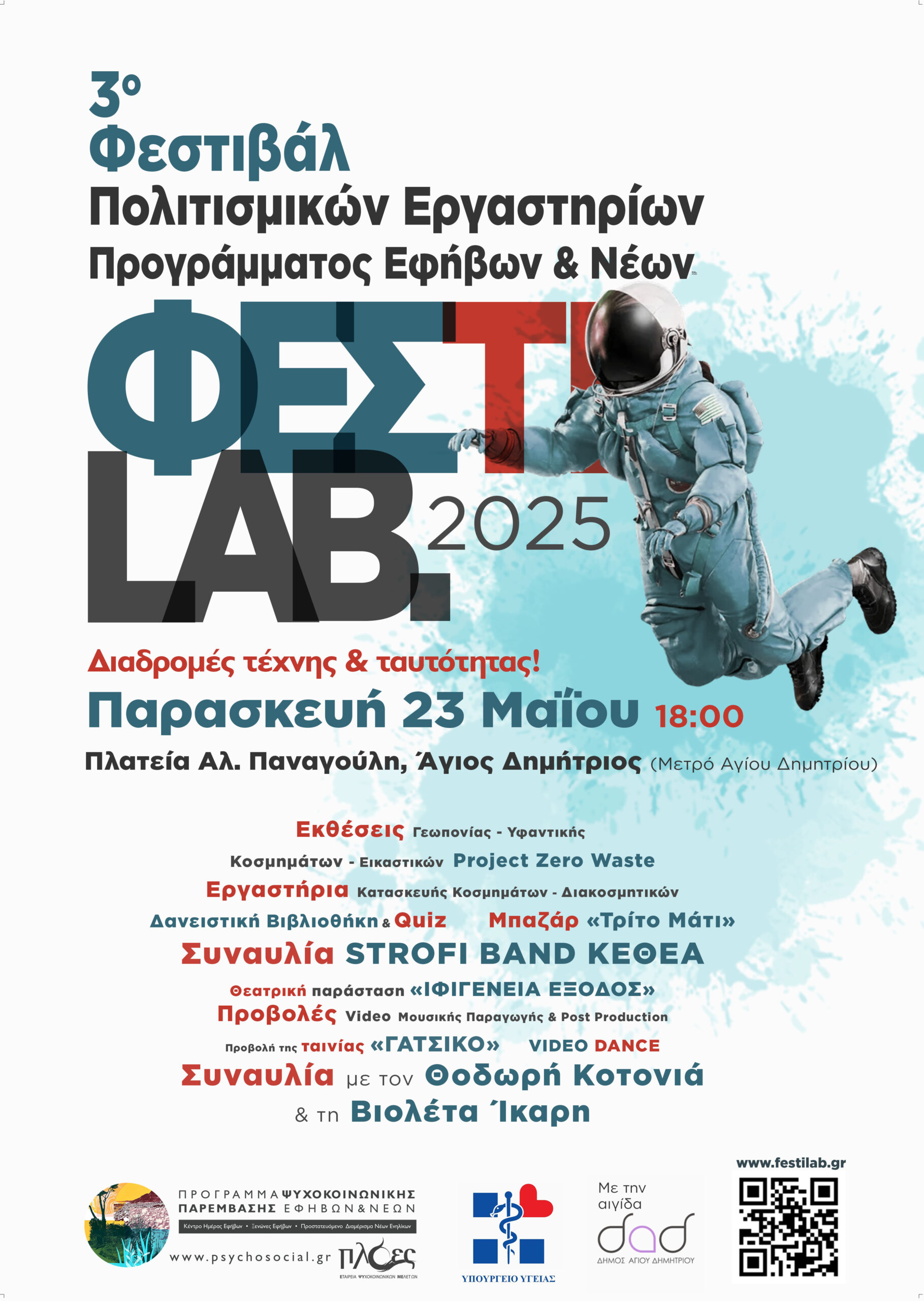 ΦΕΣΤΙLAB 2025, την Παρασκευή 23 Μαΐου 2025, στις 18:00, με δωρεάν είσοδο, στην πλατεία Αλ. Παναγούλη στον Άγιο Δημήτριο (πλησίον μετρό Αγίου Δημητρίου). Οι έφηβοι και οι έφηβες συνεργάζονται, ανακαλύπτουν τον πολιτισμό και την τέχνη και δημιουργούν συλλογικά έργα, μέσα τη συμμετοχή τους στα Πολιτισμικά, τα Κοινοτικά και τα Παραγωγικά Εργαστήρια.
