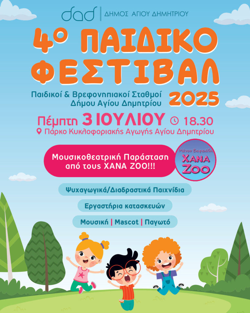 Την Πέμπτη 3 Ιουλίου 2025, στις 18:30 στο Πάρκο Κυκλοφοριακής Αγωγής οι Παιδικοί & Βρεφονηπιακοί Σταθμοί Δήμου Αγίου Δημητρίου, οργανώνουν -για τα παιδιά των σταθμών- το 4o ΠΑΙΔΙΚΟ ΦΕΣΤΙΒΑΛ 2025, που ήταν προγραμματισμένο την Παρασκευή 27 Ιουνίου, αλλά αναβλήθηκε λόγω καύσωνα!
