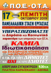 2. ΠΕΜΠΤΗ 17 ΟΚΤΩΒΡΙΟΥ 2019 προκηρύσσει ΠΑΝΕΛΛΑΔΙΚΗ ΣΤΑΣΗ ΕΡΓΑΣΙΑΣ του συνόλου του προσωπικού της Τοπικής Αυτοδιοίκησης από την έναρξη της πρωινής βάρδιας έως και τις 11.00 π.μ., ενώ θα πραγματοποιηθεί ΣΥΓΚΕΝΤΡΩΣΗ ΔΙΑΜΑΡΤΥΡΙΑΣ την ίδια ημέρα και ώρα 9.30 π.μ. έξω από τα γραφεία της Π.Ο.Ε.-Ο.Τ.Α.(Καρόλου 24-Πλατεία Καραϊσκάκη). Οι Σύλλογοι-Μέλη της Π.Ο.Ε.-Ο.Τ.Α. με βάση τις ιδιαίτερες συνθήκες του κάθε Δήμου μπορούν να προσαρμόσουν με δικές τους αποφάσεις την Στάση Εργασίας.