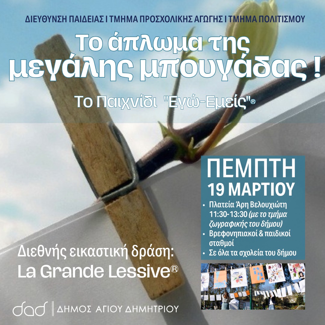 Η «LA GRANDE LESSIVE» είναι μια διεθνής εικαστική δράση, η οποία πραγματοποιείται δύο φορές το χρόνο, σε ημερομηνίες που ανακοινώνονται από την οργανωτική επιτροπή, που εδρεύει στη Γαλλία. Συμμετέχουν σε αυτήν 94 χώρες από τις πέντε ηπείρους και συμβάλλει στην ανάπτυξη κοινωνικών δεσμών, επιδιώκοντας την ένωση όσων συμμετέχουν με έργα τους σε μια παγκόσμια καλλιτεχνική κοινότητα, στην ανάπτυξη κοινωνικών δεσμών, ανοίγοντας παράλληλα ένα διαδραστικό διάλογο μεταξύ παιδιών και ενηλίκων. Η πρόκληση της «LA GRANDE LESSIVE – ΜΕΓΑΛΗΣ ΜΠΟΥΓΑΔΑΣ» στοχεύει, παράλληλα, στην ανάδειξη της μοναδικότητας του καθενός.