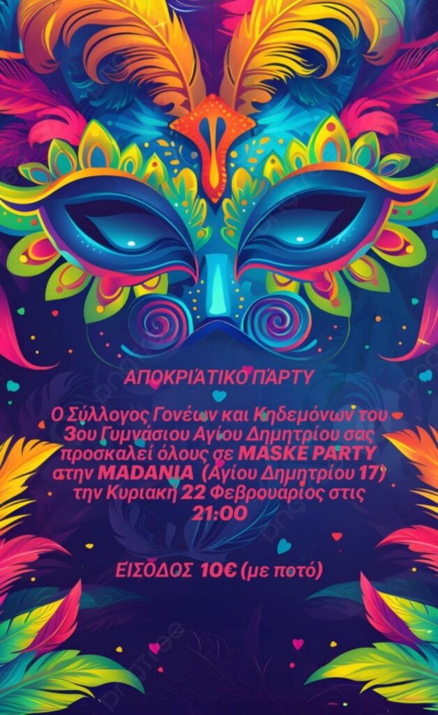 Σας προσκαλούμε στο καθιερωμένο Maske Party, που θα πραγματοποιηθεί στο MADANIA, Αγίου Δημητρίου 17, Άγιος Δημήτριος, την Κυριακή 22 Φεβρουαρίου και ώρα 21:00.
