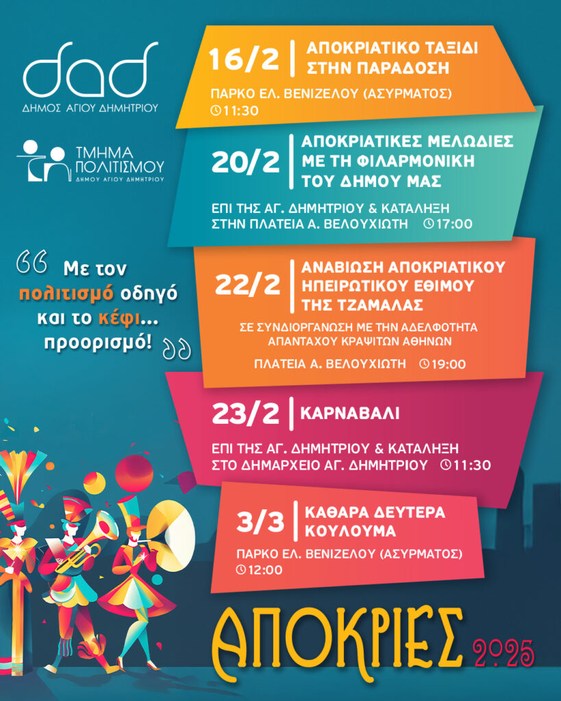 Ο Δήμος Αγίου Δημητρίου, με τo συντονισμό του Τμήματος Πολιτισμού, διοργανώνει ένα πλούσιο αποκριάτικο πρόγραμμα με μουσικές, χορούς και παιχνίδια για όλες τις ηλικίες. Στόχος η διασκέδαση μικρών και μεγάλων σε ένα γλέντι που θα βρίσκονται στο επίκεντρο τα ήθη και τα έθιμα του τόπου μας.