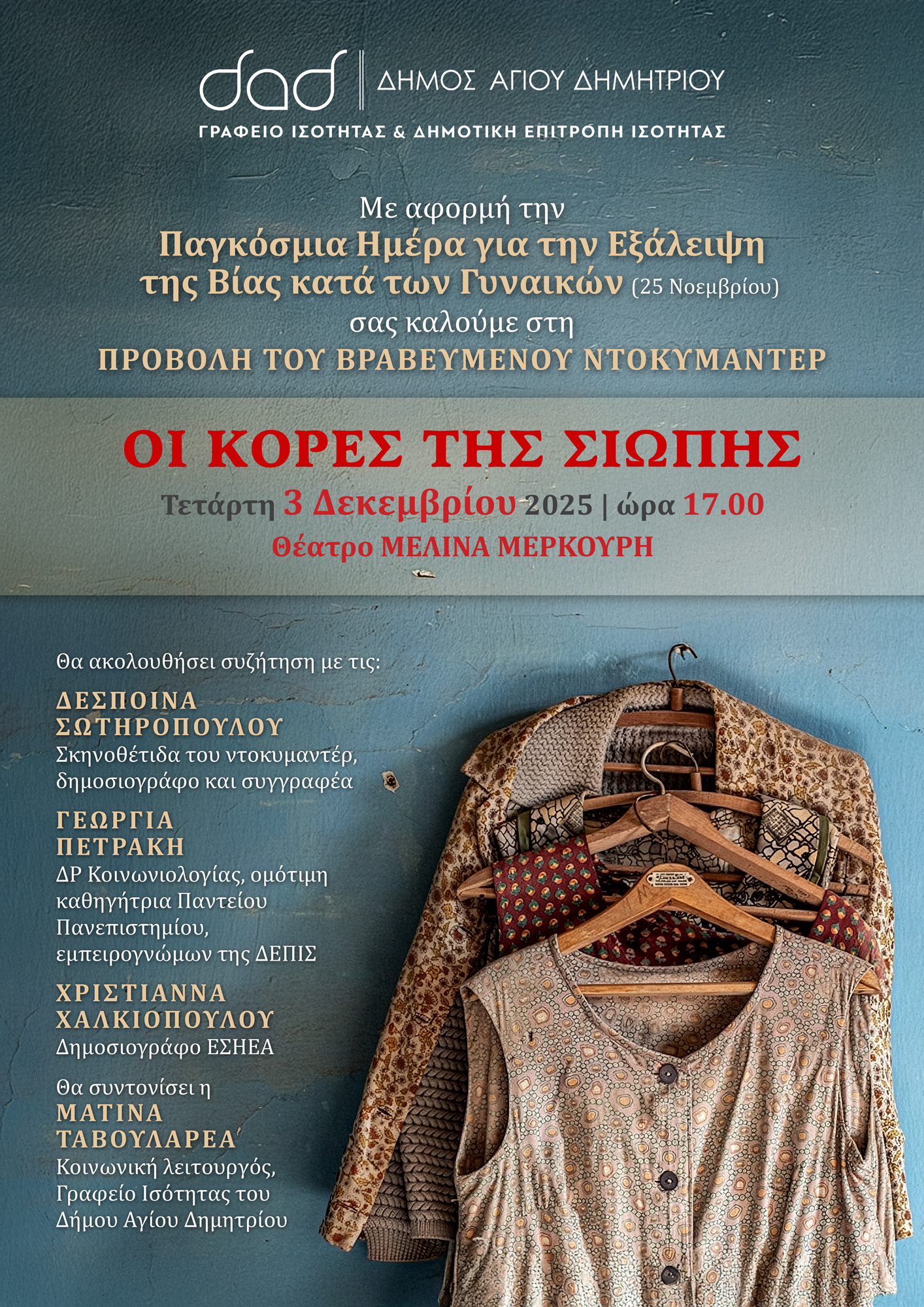 Το Γραφείο Ισότητα του Δήμου Αγίου Δημητρίου και η Δημοτική Επιτροπή Ισότητας , με αφορμή την 25η Νοεμβρίου, Παγκόσμια Ημέρα