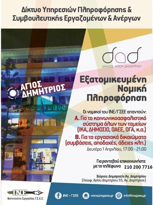 Το Δίκτυο Υπηρεσιών Πληροφόρησης και Συμβουλευτικής Εργαζομένων και Ανέργων σε συνεργασία με το Ινστιτούτο Εργασίας της ΓΣΕΕ (ΙΝΕ/ΓΣΕΕ), παρέχουν εξατομικευμένη
