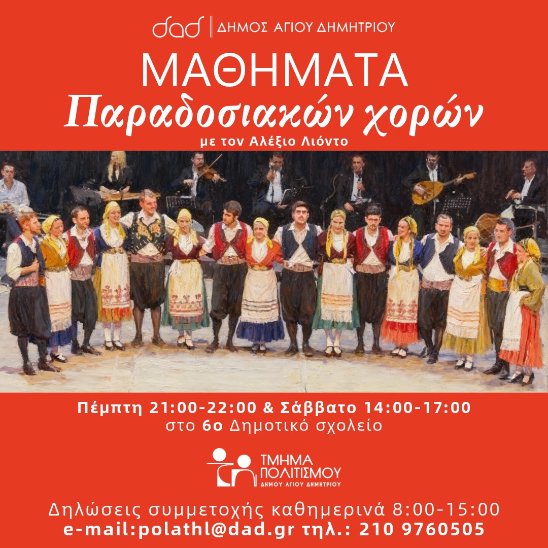 Ο Δήμος Αγίου Δημητρίου και το Τμήμα Πολιτισμού, προσκαλεί όλους τους δημότες να συμμετάσχουν στα μαθήματα παραδοσιακού χορού, με στόχο