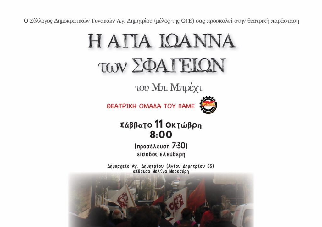 Ο Σύλλογος Δημοκρατικών Γυναικών (μέλος της ΟΓΕ), σας προσκαλεί στην θεατρική παράσταση η Αγία Ιωάννα των Σφαγείων του Μπ. Μπρέχτ