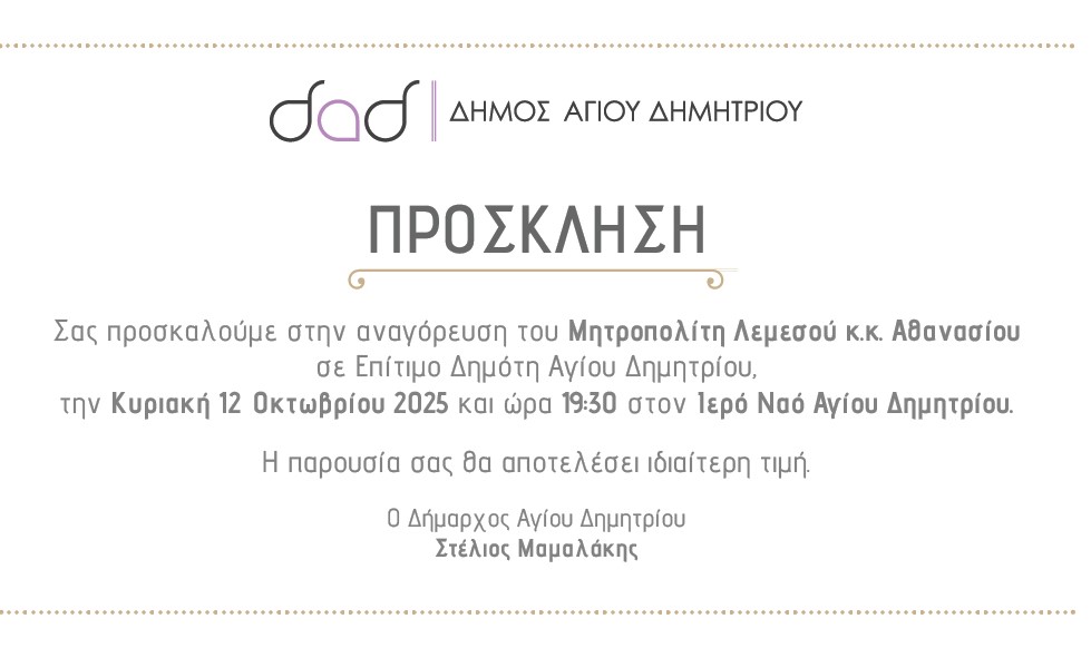 Ο Δήμος Αγίου Δημητρίου, με απόφαση του Δημοτικού Συμβουλίου, τιμά τον Μητροπολίτη Λεμεσού κ.κ. Αθανάσιο, ανακηρύσσοντάς τον σε επίτιμο δημότη
