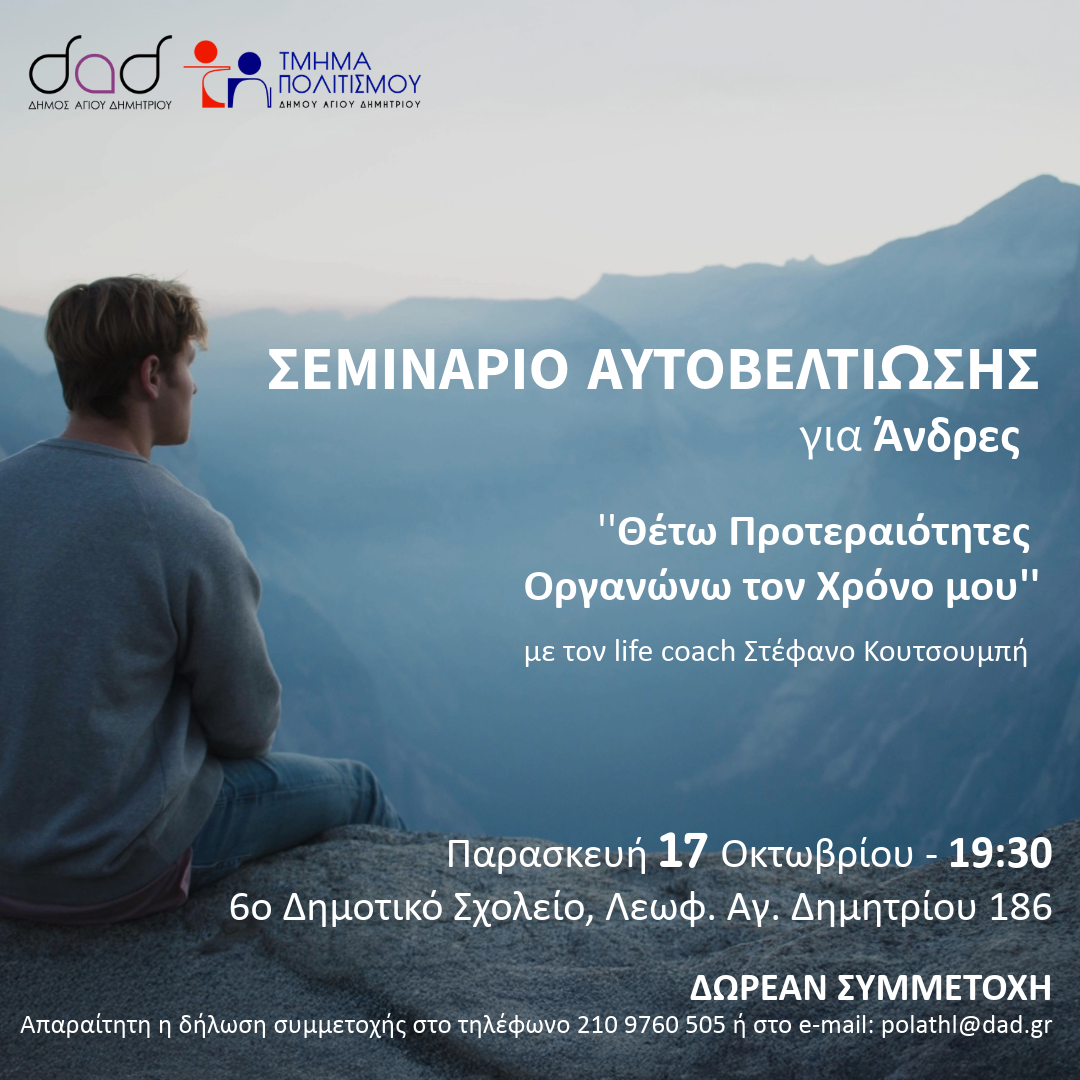 Άρχισαν οι αιτήσεις Δωρεάν συμμετοχής στα σεμινάρια αυτοβελτίωσης για άνδρες, από το Τμήμα Πολιτισμού του Δήμου Αγίου Δημητρίου, με θέμα: