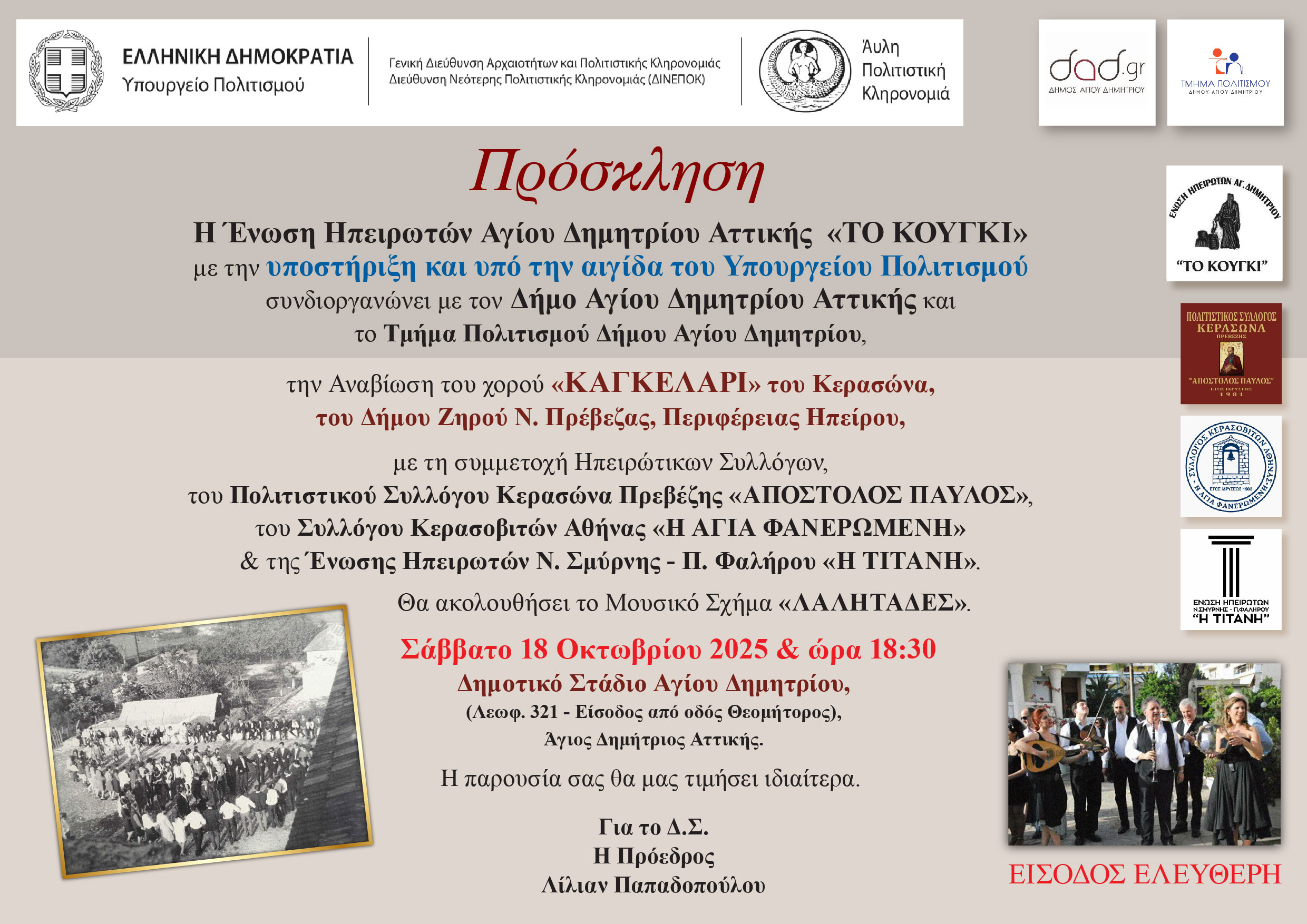 Η Ένωση Ηπειρωτών Αγίου Δημητρίου "Το Κούγκι" με την υποστήριξη και υπό την αιγίδα του Υπουργείου Πολιτισμού, συνδιοργανώνει με το