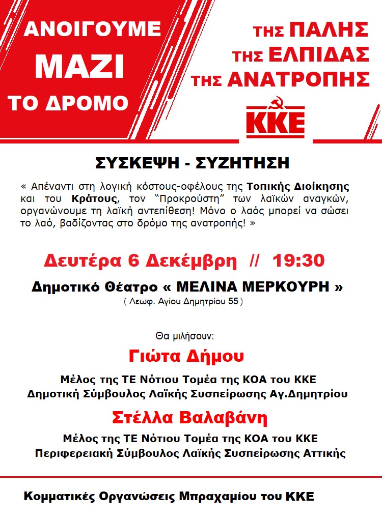 Οι Κομματικές Οργανώσεις του ΚΚΕ Αγίου Δημητρίου διοργανώνουν σύσκεψη - συζήτηση με θέμα "Απέναντι στη λογική κόστους - οφέλους της