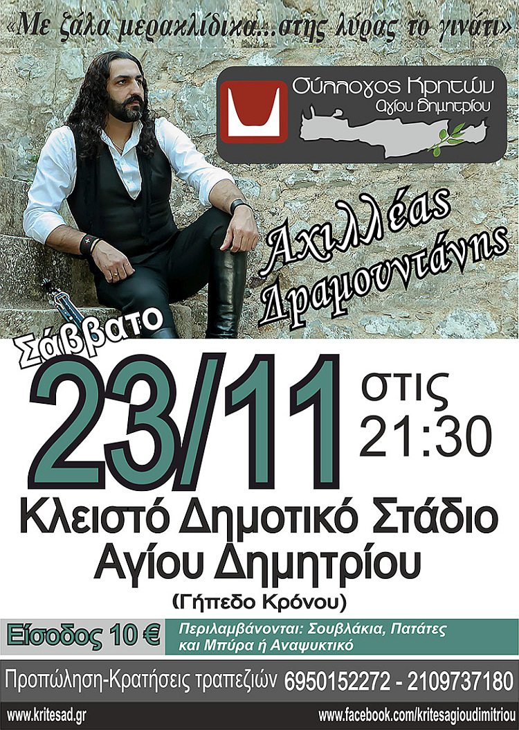 Ο Πρόεδρος και το Δ.Σ. του Συλλόγου Κρητών Αγίου Δημητρίου σας προσκαλούν στην εκδήλωση, "Με ζάλα μερακλίδικα... στης λύρας το γινάτι",