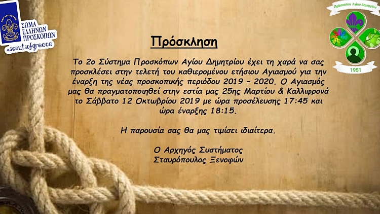 Το 2ο Σύστημα Προσκόπων Αγίου Δημητρίου, σας προσκαλεί στην τελετή του Αγιασμού για την έναρξη της περιόδου 2019-20, που θα