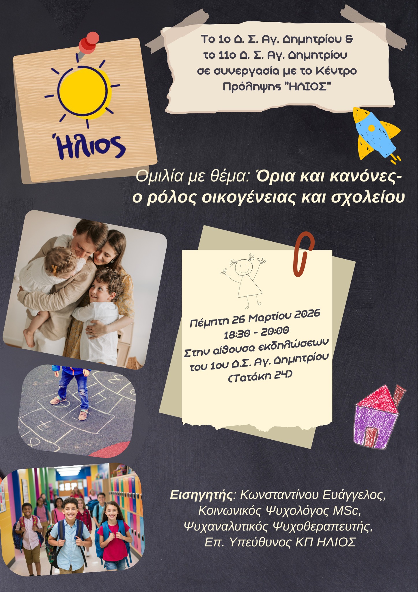Την Πέμπτη 26 Μαρτίου 2026 και ώρα έναρξης στις 18:30 θα πραγματοποιηθεί ομιλία - συζήτηση με γονείς και παιδαγωγούς στο