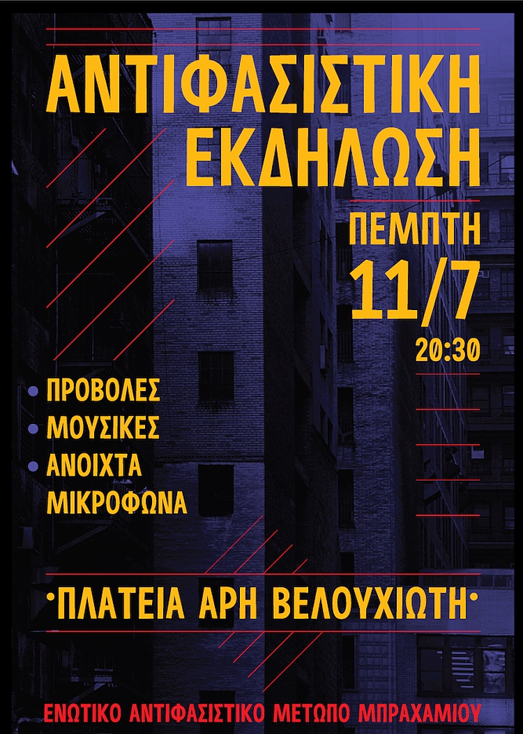 Το Ενωτικό Αντιφασιστικό Μέτωπο Μπραχαμίου, σας προσκαλεί στην αντιφασιστική εκδήλωση που διοργανώνει την Πέμπτη 11 Ιουλίου 2019 και ώρα 20:30