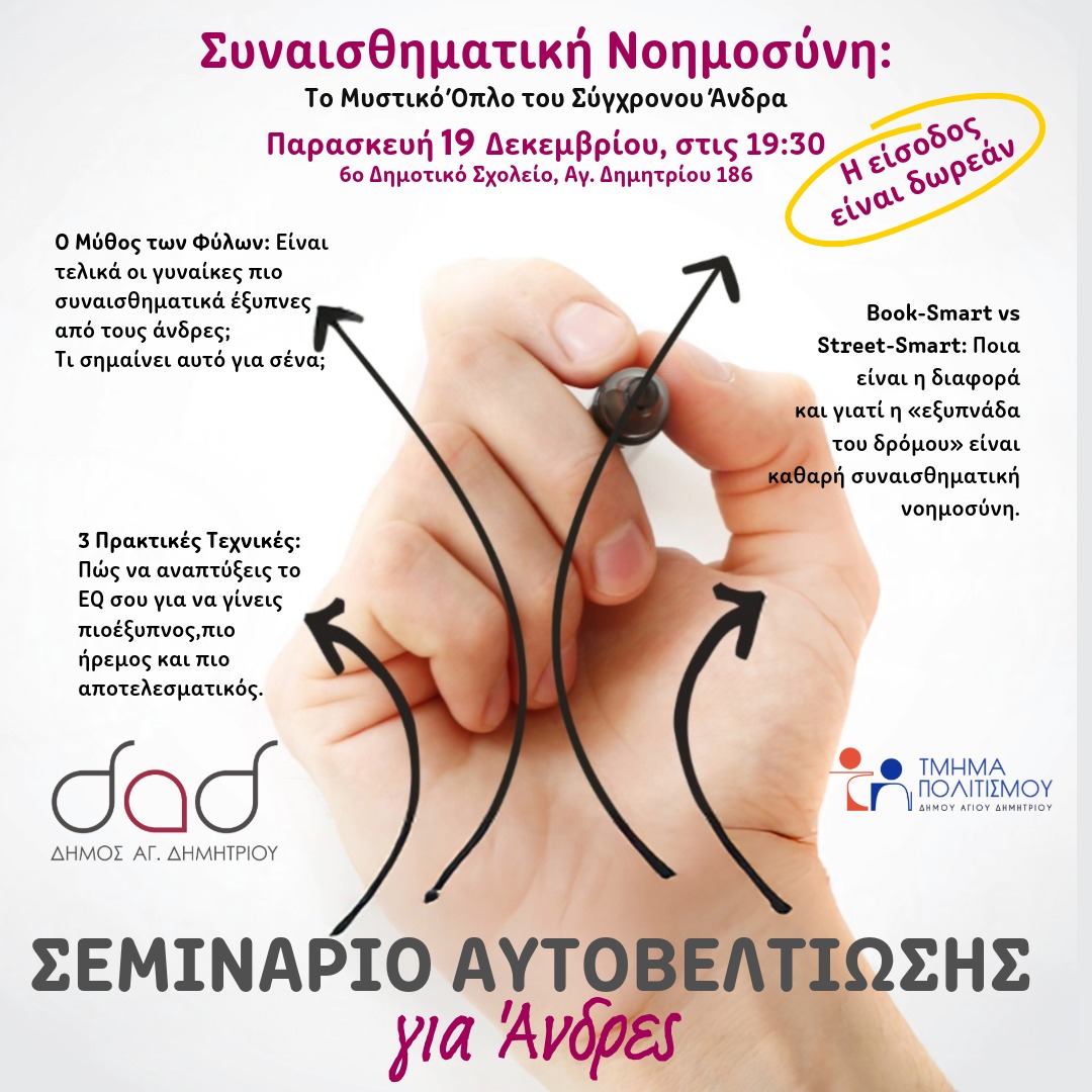 Συνεχίζονται οι συναντήσεις μόνο για άνδρες με το life coach Stefanos Koutsoumpis, PhD. Στο επόμενο σεμινάριο την Παρασκευή 19 Δεκεμβρίου,