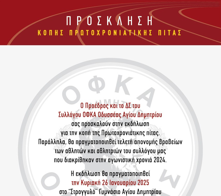 Το ΔΣ του Συλλόγου ΟΦΚΑ ΟΔΥΣΣΕΑΣ Αγίου Δημητρίου σας προσκαλεί στην κοπή της Πρωτοχρονιάτικης Πίτας του Συλλόγου, που θα πραγματοποιηθεί την Κυριακή
