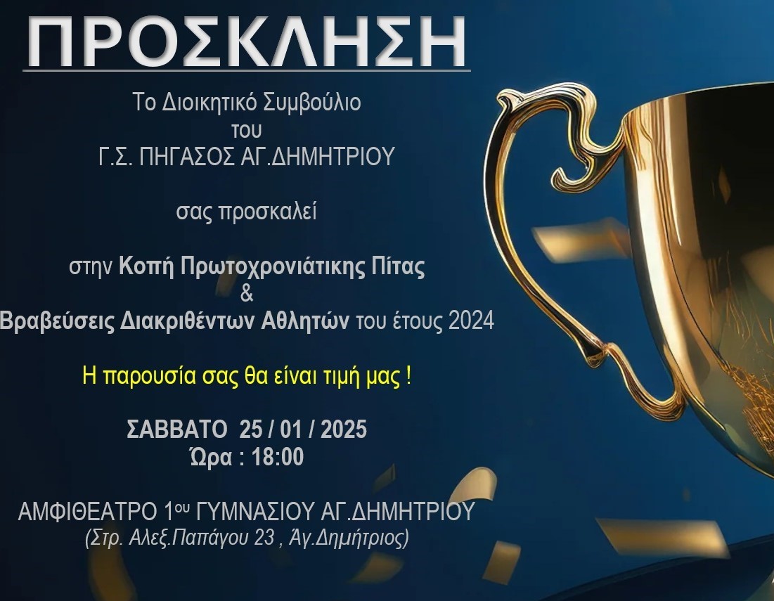 Το ΔΣ του Αθλητικού Σωματείου Κλασικού Αθλητισμού ΓΣ ΠΗΓΑΣΟΣ ΑΓΙΟΥ ΔΗΜΗΤΡΙΟΥ, σας προσκαλεί στην Ετήσια Κοπή της Πρωτοχρονιάτικης Πίτας &