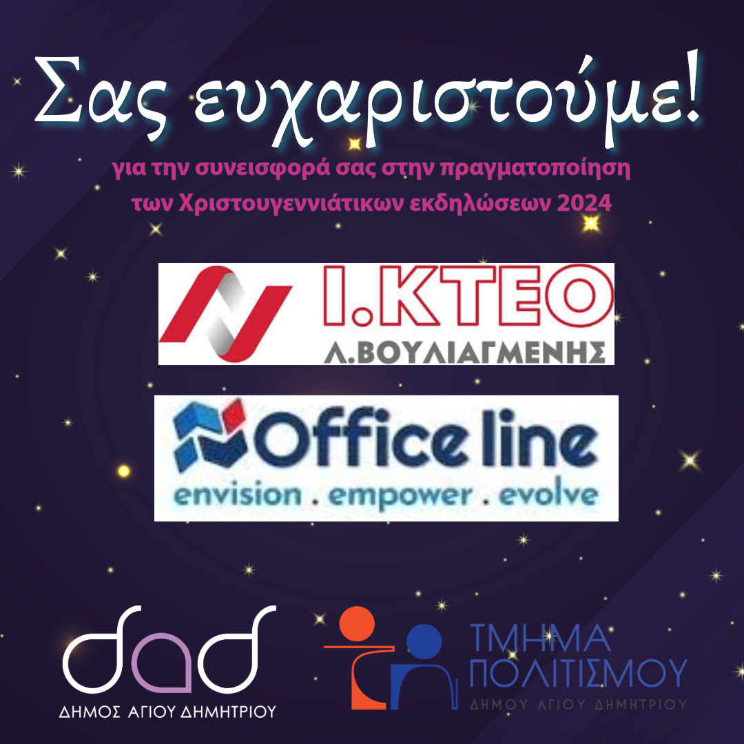 Εκφράζουμε τις θερμότερες ευχαριστίες μας για τη χορηγία των δύο εταιρειών στις χριστουγεννιάτικες εκδηλώσεις του Δήμου μας. Με τις ευγενικές