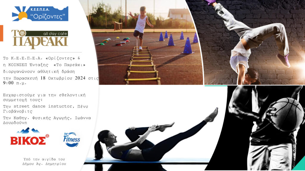 Το Κέντρο Ειδικής Εκπαίδευσης Παιδιών και Ενηλίκων με Αναπηρία (Κ.Ε.Ε.Π.Ε.Α.) «Ορίζοντες» και η Κοινωνική Συνεταιριστική Επιχείρηση (ΚΟΙΝΣΕΠ) Ένταξης «Το Παρεάκι» σας προσκαλούν στην αθλητική δράση στην Πλατεία Παναγούλη στον Αγ. Δημήτριο, την Παρασκευή 18 Οκτωβρίου 2024. Ώρα έναρξης 9:00 π.μ.