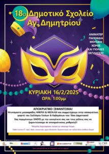 Ο Σύλλογος Γονέων και Κηδεμόνων του 18ου Δημοτικού Σχολείου σας καλεί σε αποκριάτικο ξεφάντωμα την Κυριακή 16/2/25 στις 13:00 με