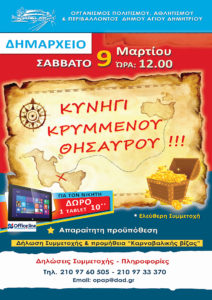 ΣΑΒΒΑΤΟ 9 ΜΑΡΤΙΟΥ 2019 «Κυνήγι κρυµµένου Θησαυρού» Ώρα:12.00 | ΕΛΕΥΘΕΡΗ ΣΥΜΜΕΤΟΧΗ Το Σάββατο 9-3-2019 και ώρα 12:00, µαζευόµαστε στο Δηµαρχείο