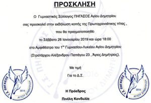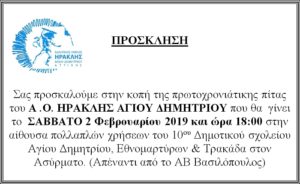 Την πρωτοχρονιάτικη πίτα του κόβει ο Γ.Σ. "Πήγασος" Αγ. Δημητρίου, το Σάββατο 26 Ιανουαρίου 2019 και ώρα 18:00, στο αμφιθέατρο