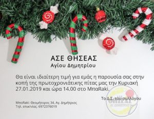 Το Δ.Σ. του Α.Σ.Ε. «Θησέας», σας προσκαλεί στην κοπή της πρωτοχρονιάτικης πίτας του, που θα γίνει την Κυριακή 27-1-2019 και ώρα