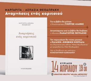 Την Κυριακή 14 Απριλίου 2024, στις 19:30 μ.μ., στο Δημοτικό Θέατρο Μελίνα Μερκούρη, η Μαργαρίτα Θεοδωράκη, θα παρουσιάσει το βιβλίο