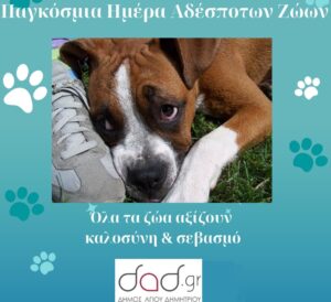 Με αφορμή την Παγκόσμια Ημέρα Αδέσποτων Ζώων ο Δήμαρχος Αγίου Δημητρίου Στέλιος Μαμαλάκης δήλωσε: «Ο Δήμος Αγίου Δημητρίου έχει θέσει