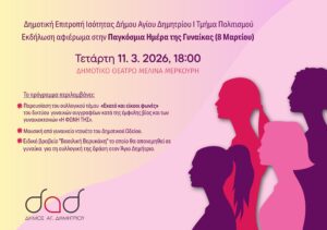 Η Δημοτική Επιτροπή Ισότητας του Δήμου Αγίου Δημητρίου (ΔΕΠΙΣ), το γραφείο Ισότητας και το Τμήμα Πολιτισμού με αφορμή την Παγκόσμια