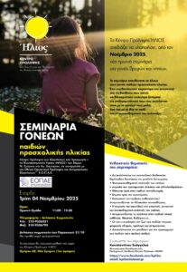 Το Κέντρο Πρόληψης Εξαρτήσεων ''ΗΛΙΟΣ'' οργανώνει νέο Κύκλο Σεμιναρίων Γονέων με παιδιά στην προσχολική ηλικία, που αρχίζουν την Τρίτη 4