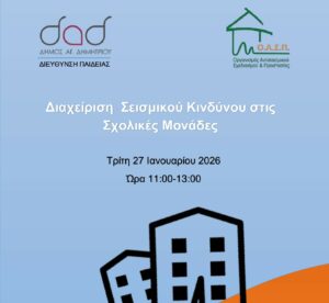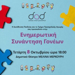 Η Διεύθυνση Παιδείας και το Τμήμα Προσχολικής Αγωγής του Δήμου Αγίου Δημητρίου, σας προσκαλούν σε "Ενημερωτική Συνάντηση Γονέων" στο δημοτικό