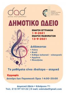 Το Δημοτικό Ωδείο Αγίου Δημητρίου "Μίκης Θεοδωράκης" ανοίγει τις πόρτες του και σε νέα τμήματα μουσικής παιδείας. Έτσι από φέτος