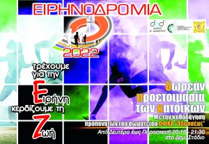 Την Κυριακή 15 Μαΐου 2022, οι προβολείς του δρομικού κινήματος στρέφονται στο Δήμο Αγίου Δημητρίου, με την διοργάνωση της «Ειρηνοδρομίας»,