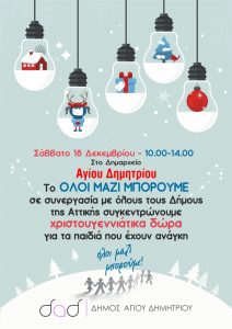 Ο Δήμος Αγίου Δημητρίου συμμετέχει και αυτά τα Χριστούγεννα στη δράση του "Όλοι μαζί μπορούμε", συγκεντρώνοντας παιχνίδια για τα παιδιά