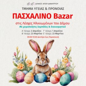 Οι Λέσχες Ηλικιωμένων του Δήμου μας σας προσκαλούν στο πασχαλινό τους bazar, γεμάτο με όμορφες χειροποίητες δημιουργίες! Ελάτε να ανακαλύψετε