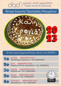 Τα πέντε ΚΑΠΗ του Δήμου Αγίου Δημητρίου, σας προσκαλούν στην κοπή της Πρωτοχρονιάτικης Πίτας τους, που θα γίνει ξεχωριστά για