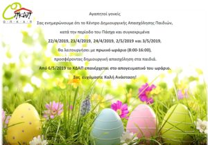 Ο Οργανισμός Παιδείας, Κοινωνικής Αλληλεγύης & Προστασίας ανακοινώνει ότι το Κέντρο Δημιουργικής Απασχόλησης Παιδιών, κατά την περίοδο του Πάσχα και