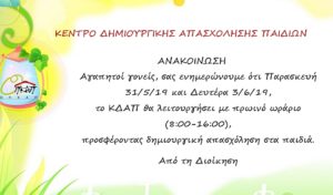 Αγαπητοί γονείς, Σας ενημερώνουμε ότι από 2 έως 10 Σεπτεμβρίου 2019, το Κέντρο Δημιουργικής Απασχόλησης Παιδιών θα λειτουργήσει με πρωινό ωράριο