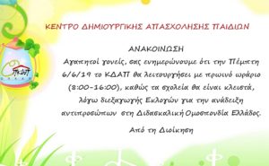 Η Διοίκηση του ΟΠΚΑΠ ανακοινώνει ότι το Κέντρο Δημιουργικής Απασχόλησης Παιδιών, την Παρασκευή 31/5/2019 και τη Δευτέρα 3/6/2019, θα λειτουργήσει