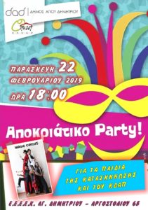 Ο Οργανισμός Παιδείας, Κοινωνικής Αλληλεγγύης & Προστασίας διοργανώνει αποκριάτικο πάρτι, με ζογκλέρ, ταχυδακτυλουργούς, πολύ τραγούδι και χορό, για τα παιδιά