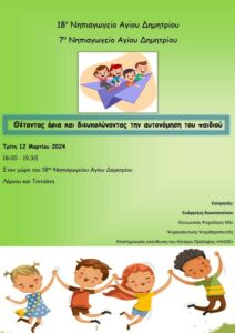 Σήμερα Πέμπτη 14 Μαρτίου 2024 και ώρα έναρξης 18:30 θα πραγματοποιηθεί ομιλία και συζήτηση με γονείς και παιδαγωγούς στο χώρο