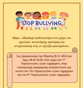 Η Διεύθυνση Παιδείας του Δήμου Αγίου Δημητρίου και το Κέντρο Πρόληψης Εξαρτήσεων & Προαγωγής της Ψυχοκοινωνικής Υγείας "Ήλιος", διοργανώνουν ημερίδα/ομιλία