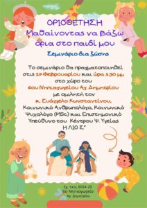 Την Τρίτη 12 Μαρτίου 2024 και ώρα έναρξης 18:00 θα πραγματοποιηθεί ομιλία και συζήτηση με γονείς και παιδαγωγούς στο χώρο