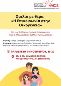 Την Παρασκευή 14 Νοεμβρίου 2025, στις 18:30 θα πραγματοποιηθεί στο 13ο & 21ο Δημοτικό Σχολείο Αγίου Δημητρίου (Αργοστολίου 118) ομιλία - συζήτηση με γονείς και παιδαγωγούς με θέμα: «Η επικοινωνία στην οικογένεια», με πρωτοβουλία των Συλλόγων Γονέων και