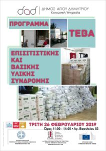 Συνεχίζεται η διάθεση προϊόντων στους δικαιούχους του προγράμματος ΤΕΒΑ. Την Τρίτη 26 Φεβρουαρίου 2019, από ώρα 11:00 έως 14:00, από