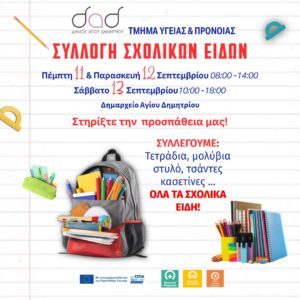 Με αφορμή την έναρξη της νέας σχολικής χρονιάς, το Τμήμα Υγείας και Πρόνοιας του δήμου μας διοργανώνει δράση συλλογής σχολικών