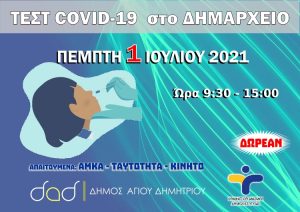 Συνεχίζονται τα τεστ ανίχνευσης κρουσμάτων κορωνοϊού με μία νέα δράση που θα πραγματοποιηθεί την Πέμπτη 1-7-2021 και από ώρα 9:30