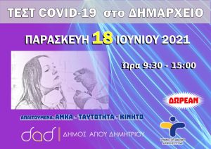 Συνεχίζονται τα τεστ ανίχνευσης κρουσμάτων κορωνοϊού με μία νέα δράση που θα πραγματοποιηθεί την Παρασκευή 18-06-2021 και από ώρα 9:30