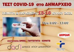 Συνεχίζονται τα τεστ ανίχνευσης κρουσμάτων κορωνοϊού με δύο δράσεις που θα πραγματοποιηθούν την Πέμπτη 15 και Παρασκευή 16 Ιουλίου 2021